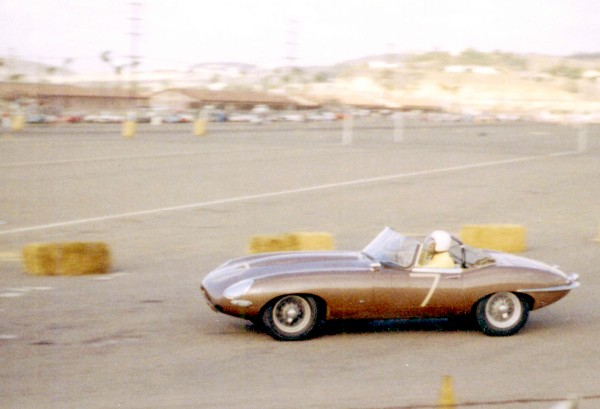 two photos showing Wally and his E-Type Jaguar in the pits at Del