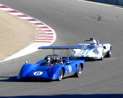 in his 6997cc. 1969 Lola T-163 after 5 laps. #77 is Tom Simpson of